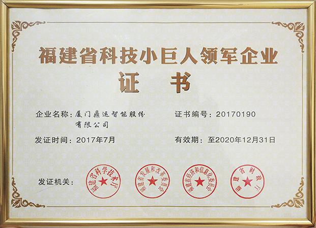 廈門鼎運智能成功列入省科技小巨人領軍企業(yè)培育發(fā)展庫,并榮獲“福建省科技小巨人領軍企業(yè)”證書。